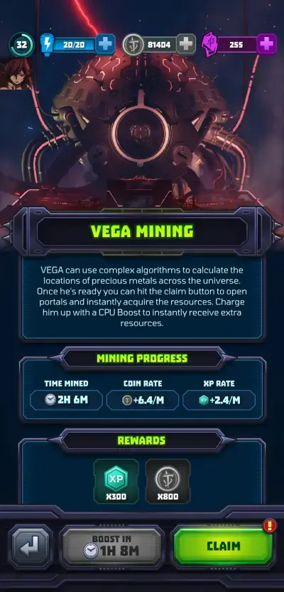One feature you should also keep close tabs on is Vega Mining. You can access this feature through the circular icon at the upper left side of the main screen, just below the gear icon. The Vega Mining lets you earn EXP and coins idly in Mighty DOOM and you can also play an ad boost here to increase both the coin rate and EXP rate earned. Although you can also spend crystals to activate the boost, we recommend saving all your crystals for crate and equipment box keys for high-grade weapons and gears.