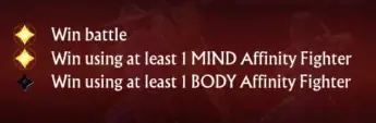- Each fighter has an Affinity (element). The weakness cycle goes Body -> Spirit -> Mind -> Body; Body is strong against Spirit; Spirit is strong against Mind.