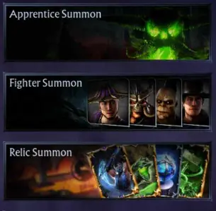 Next are the permanent banners. These are the Apprentice Summon, Fighter Summon, and Relic Summon. All of these are always available for players, and they all take Green Skull Orbs as payment.