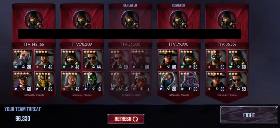 PVP in Mortal Kombat: Onslaught is done asynchronously via the Arena. In the Arena, you can pick fights with other players who are (roughly) on the same ladder level as you. Victory nets you some ladder points while losing costs you some points (and pride) – the prospective changes to your score can be seen at the bottom of each player’s banner. The higher your position on the ladder at the end of a PVP season, the bigger your payout.
