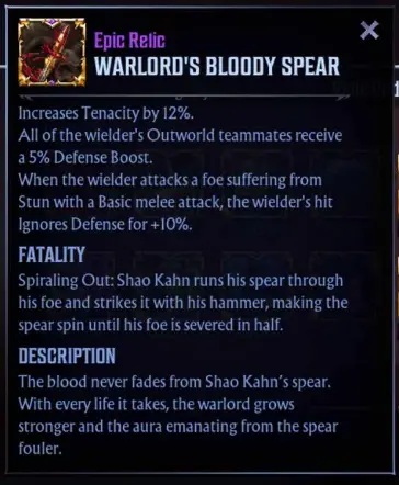 Finally, Relics are the source of the game’s Fatalities. When certain Relics are equipped to certain characters, they’ll gain access to their Fatality, a gory finisher to cap off the battle. When the last foe falls, you’ll hear the iconic “Finish Him/Her” line, and you can select any of your characters that have a Fatality ready.