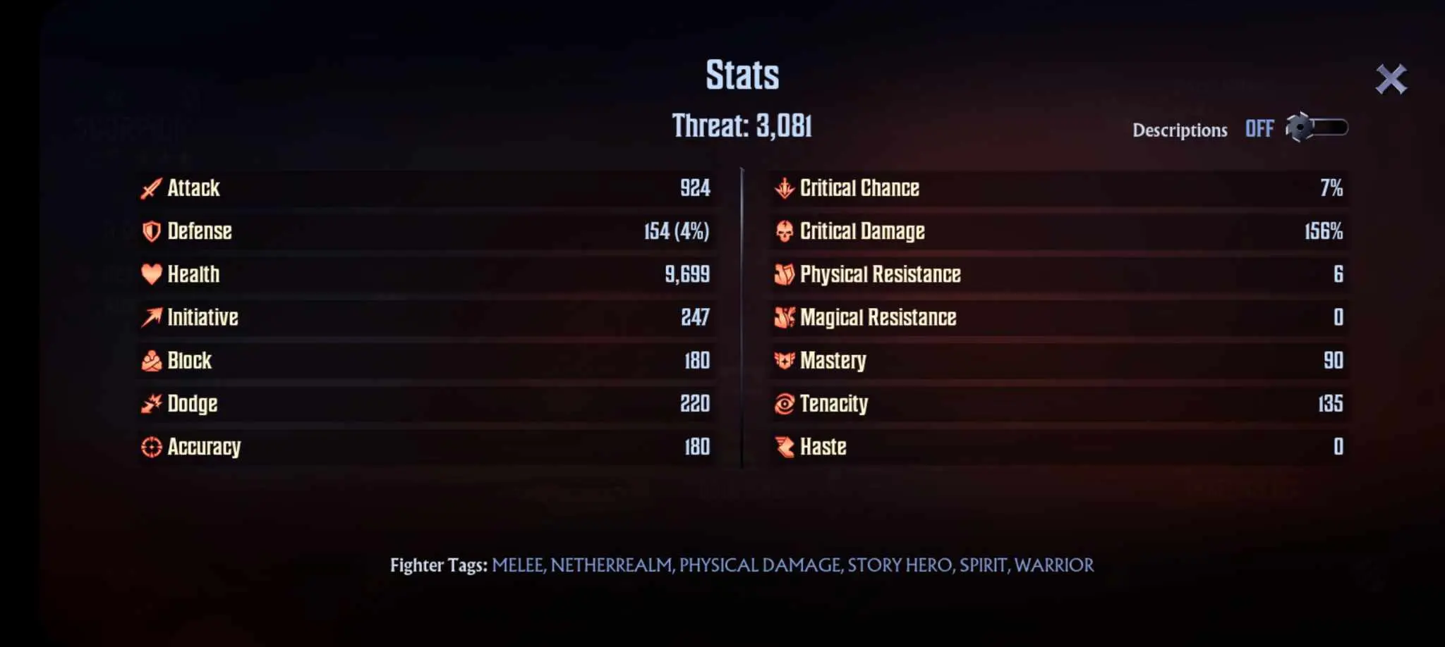 Finally, there’s Threat, a rough number that estimates a fighter’s combat power based on their raw stats and gear. Remember that this is an approximation – high Threat doesn’t mean a fighter is unstoppable!