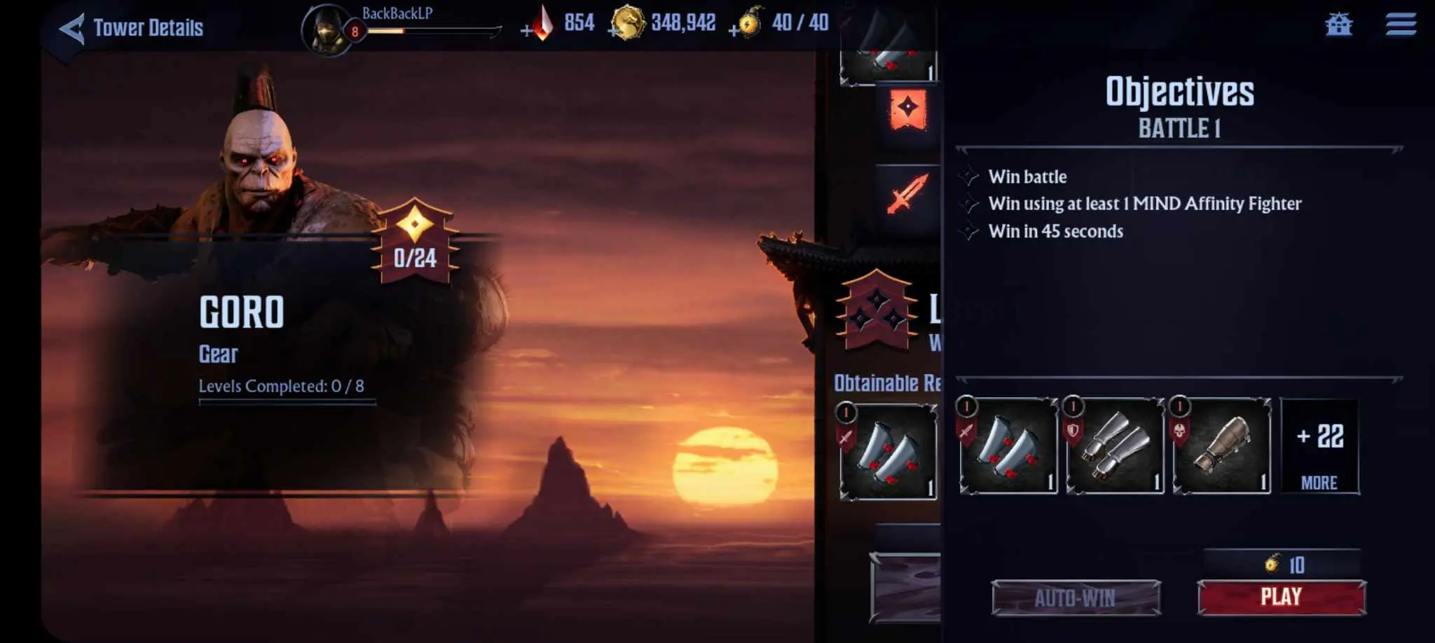 There are three things you need to know, however. Firstly, some Boss Towers are only open at certain times. These Boss Towers also tend to have daily restrictions on how many times you can enter. Secondly, each Boss Tower gives out specific types of resources; Liu Kang’s Boss Tower, for instance, yields a ton of Koins while Goro’s Boss Tower drops arm, leg, and head gear. Thirdly, challenging a floor in Boss Tower mode consumes some Tower Energy. Tower Energy regenerates on its own over time, though you can also buy refills with Arena Medals or Krystals.
