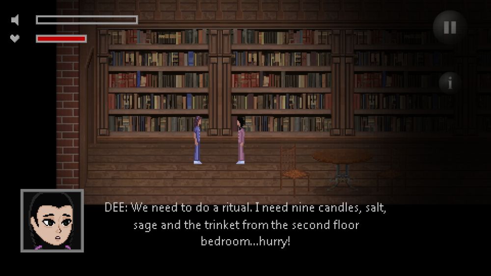 Once you have all the items, return to the library and bring them to Dee. Unfortunately, as soon as the ritual begins, Dee is revealed to be possessed by the dolls and tries to stab Esther with the trinket. Quickly tap the interact button to survive the attack…