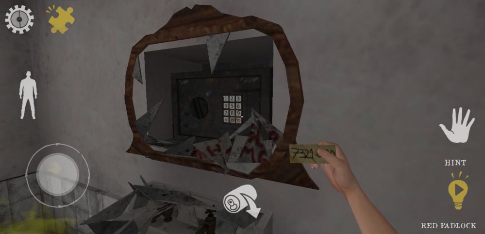 The first lock requires a red key, which is hidden in the second-floor bathroom back at the house. Bring the hammer with you and head to the bathroom, then use the hammer to smash the mirror above the sink, revealing a safe locked with a keypad.
