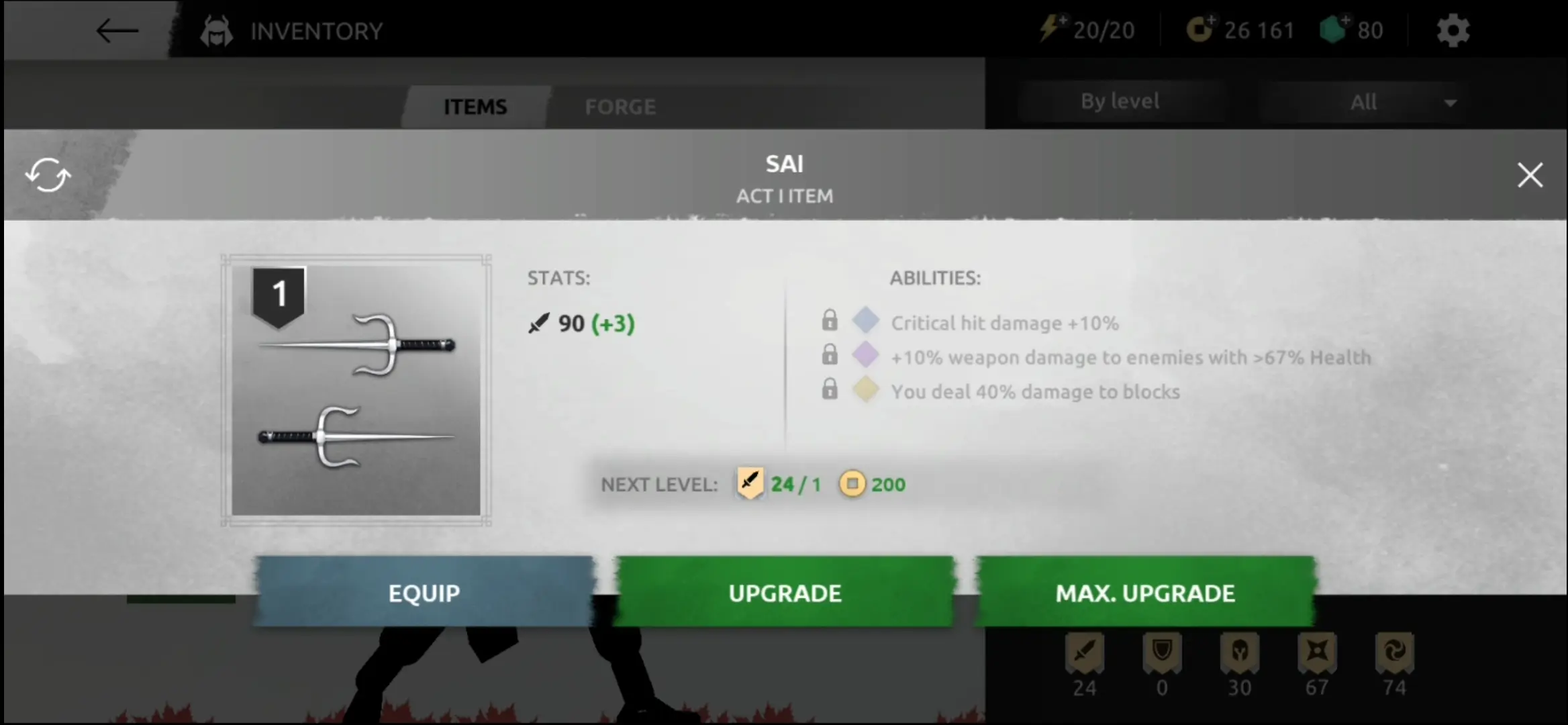 Tapping this and then the Upgrade button will ensure the improvement of your weapon (provided that you have ample resources, of course). If you wish to fully use all of the upgrade scrolls you have, tap the Max Upgrade button to exhaust all you can for that piece of equipment.