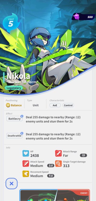 Thymes can deal 868 AoE damage to enemies once every 15 seconds. Her skill’s cooldown period becomes 0 when an allied unit enters the battlefield.