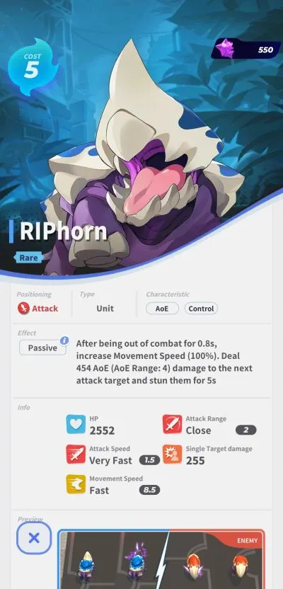 A sturdy unit that can heal all allied units by 579 HP once every 10 seconds. Trample also gains 70% attack speed when HP goes below 50%.