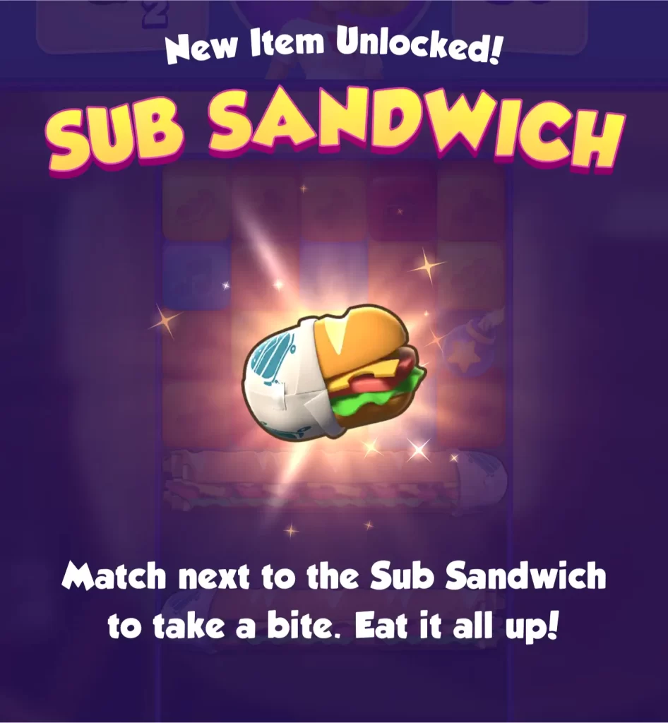 Sub Sandwiches are introduced in Level 41. Make matches next to them to take a bite. You’ll need to eat it all up for the obstacle to disappear. One match is equal to one bite, no matter how many cubes are next to the Sun Sandwich. Bites will always start from the end without a wrapper. The Sub Sandwich is cleared when there’s only the wrapper left. Subs usually come in groups and are lined up on top of each other. Vertical Rockets, Bombs (and their combinations) along with Pogo Sticks are very effective against them.