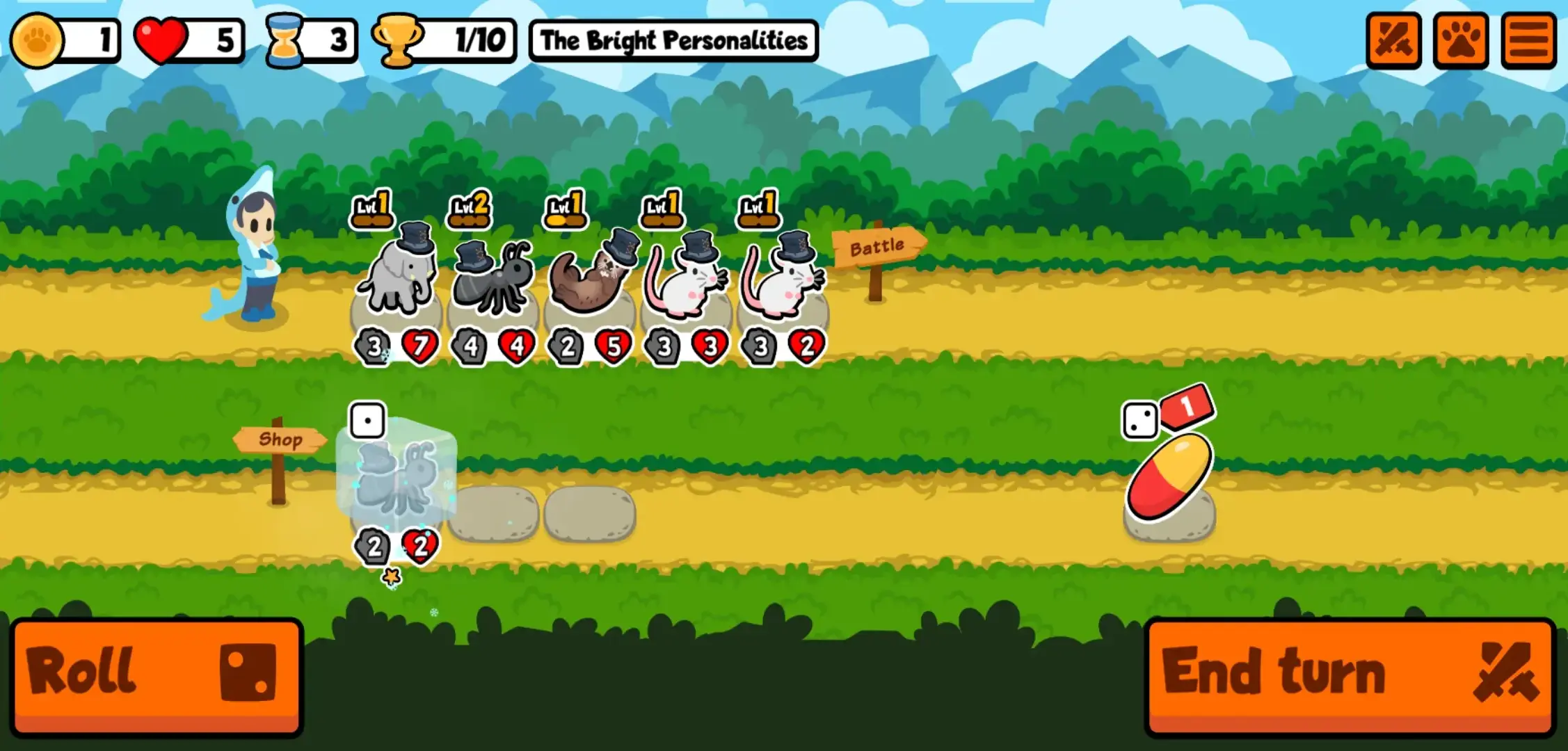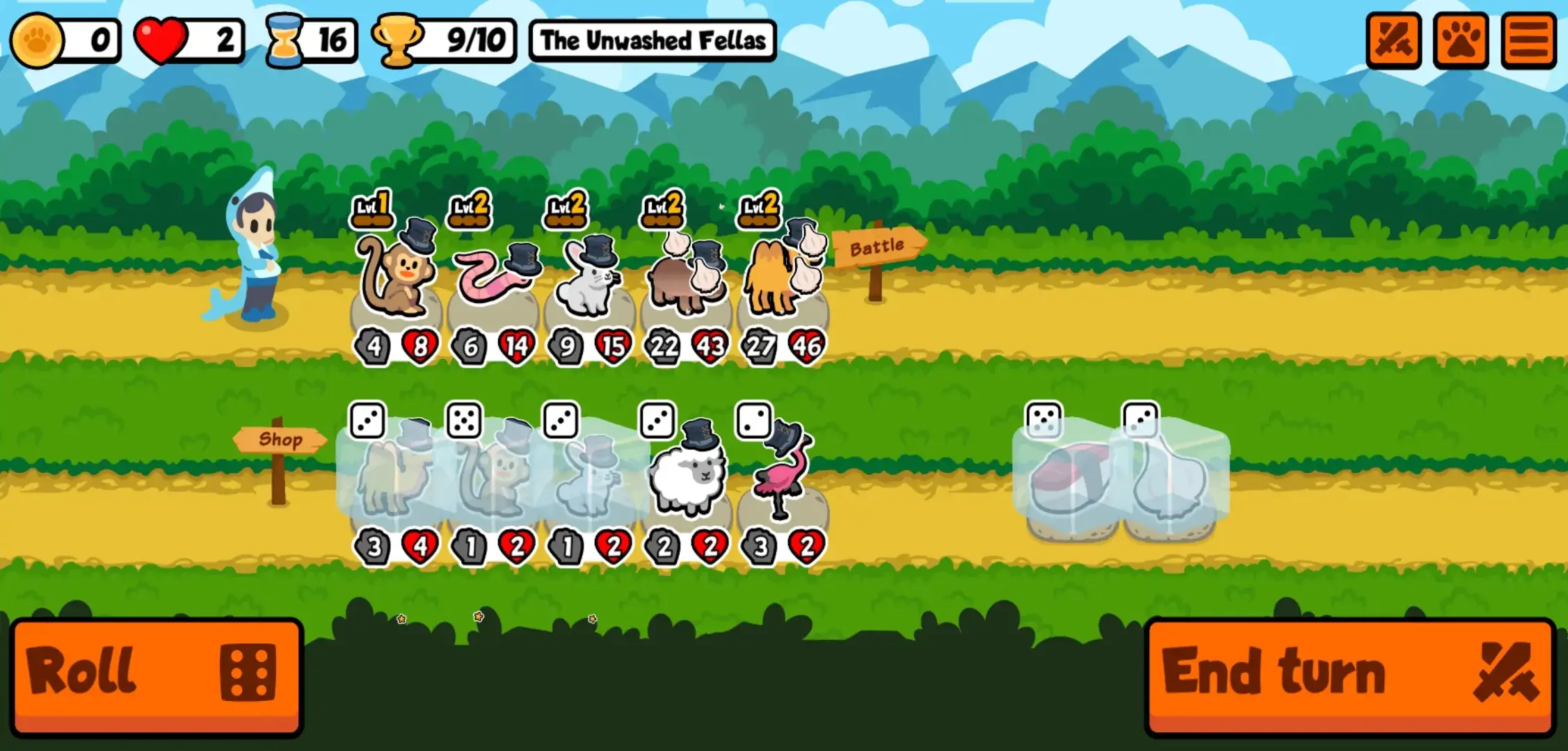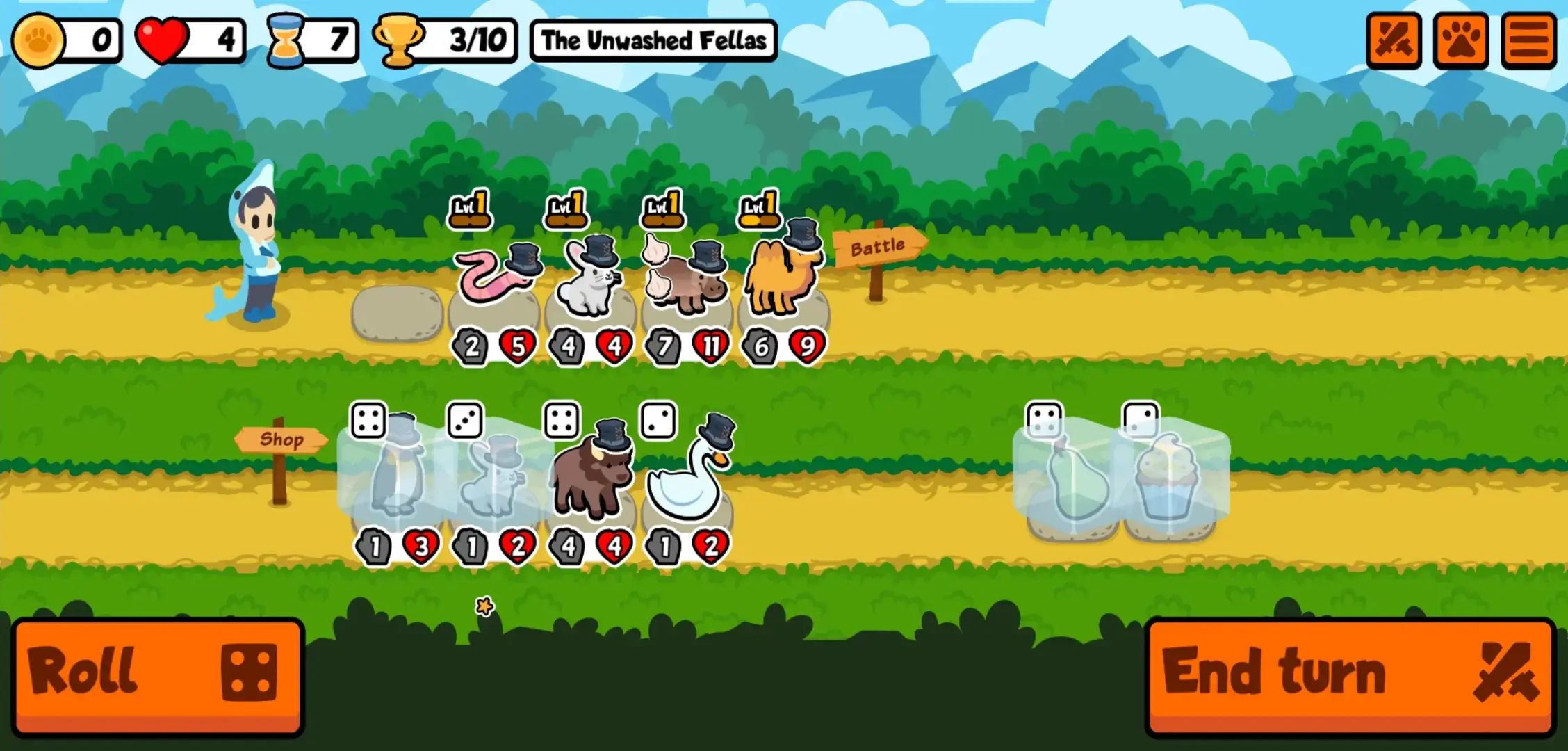 However, if there is a pet or food item that you wish to keep without losing them the next time you roll, you may choose to Freeze them. Simply tap a pet or a food item you wish to preserve and then tap the Freeze button which should appear next to the End Turn button below. Freezing is completely free of charge and you may do this to any or all of the shop items. Additionally, this is quite useful when you’re completely out of Gold and you want to buy that one shop item that you need next turn.
