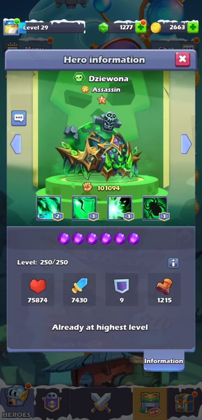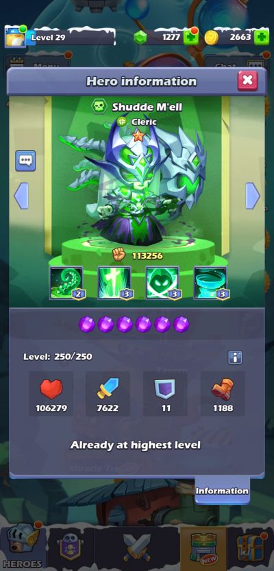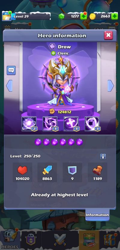 Drow’s Heart-taking Thorn deals 182% of ATK as DMG to 4 random enemies and heals allies for 75% of her ATK for 6 rounds. This skill has an 80% chance to stun cleric class enemies for 2 rounds and deal 50% of ATK as bleed DMG to them for 2 rounds.