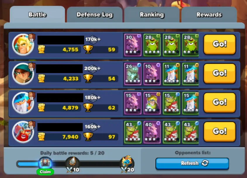 If your opponents are too strong or you don’t want to deal with their teams, you can opt to refresh your five opponents. This can be done for free once every 30 minutes, though you can also skip the line by paying gems.
