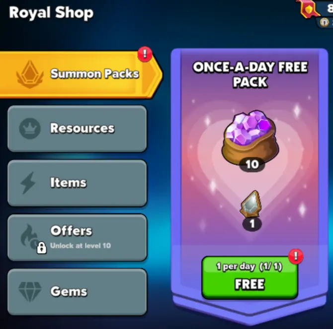 Yes, there’s a free daily shop pack that you can claim. Just swing by the shop and claim your freebies. Not much, but it’s something, and you can watch up to 2 ads to increase your gains.