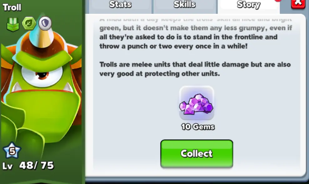 - Check the stories of units you’ve collected for a small number of gems.