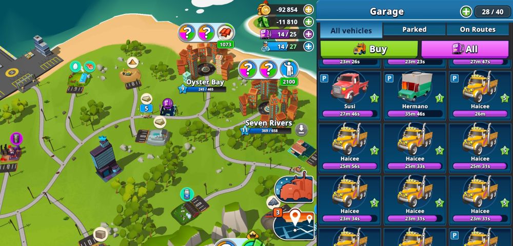 Likewise, if you run out of fuel or need extra drivers for a limited period of time, you can also click on the “+” icon beside these resources at the top of your screen to play ads and earn bits of them. You can also tap on a city with currently no requests and play a video add to refresh their status.