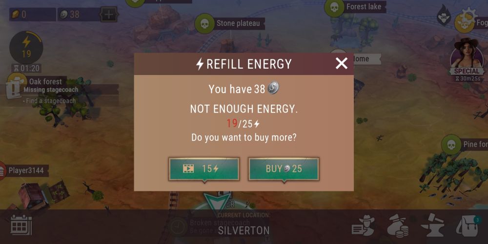 If you do not have enough energy to use the run function and travel to an area at a fraction of the time it would take to walk there, you have 2 choices to obtain extra energy. The first one requires you to consume silver and 15 energy costs 15 silver. Since silver is difficult to earn, it is best to save it for something else. The other option grants you 15 energy as well and all you need to do is to play a short video ad to obtain it.
