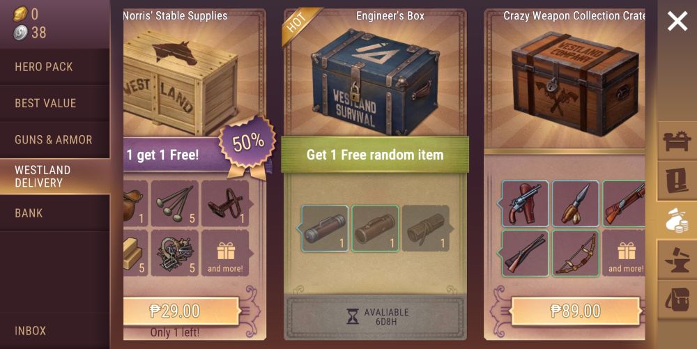 The shop in Westland Survival that you can access through the bag and coins icon at the bottom of the screen holds plenty of packages and boosts for players who are willing to spend real cash on their adventure. Free players, however, are not left behind as there is an item from the shop you can acquire through ad boosts. Under the Westland Delivery Tab, you can grab an Engineer’s Box, which contains a random weapon or armor blueprint for playing a short video ad. You can only obtain one once a week but free blueprints are definitely an opportunity you should never pass on.