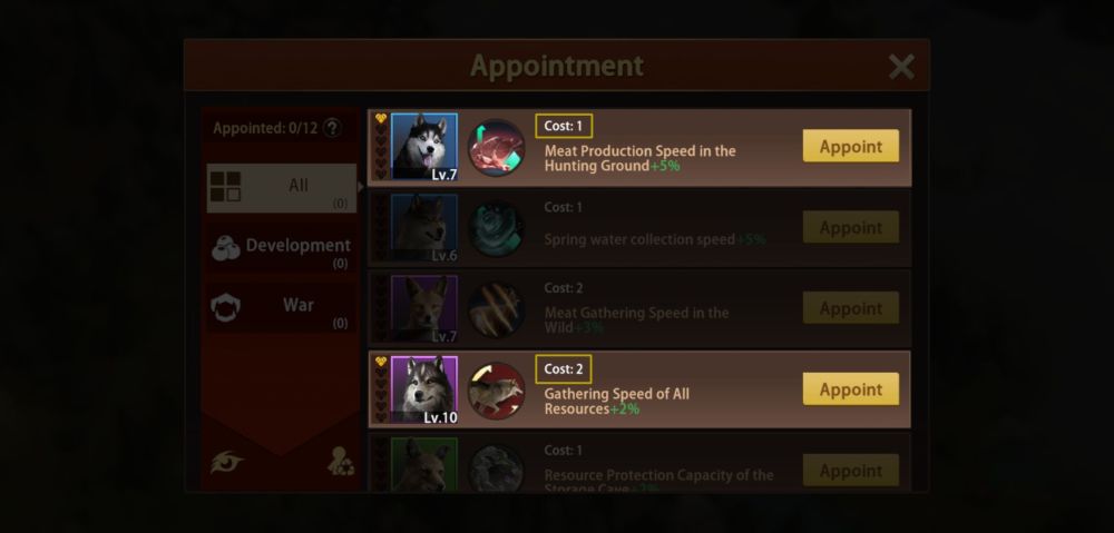 - Appointment: As mentioned in an earlier section of this guide, the Appointment attribute affects base development and overall wartime capabilities. You may choose a wolf hero in the Wolf Throne’s Appointment tab to gain boosts for either aspect.