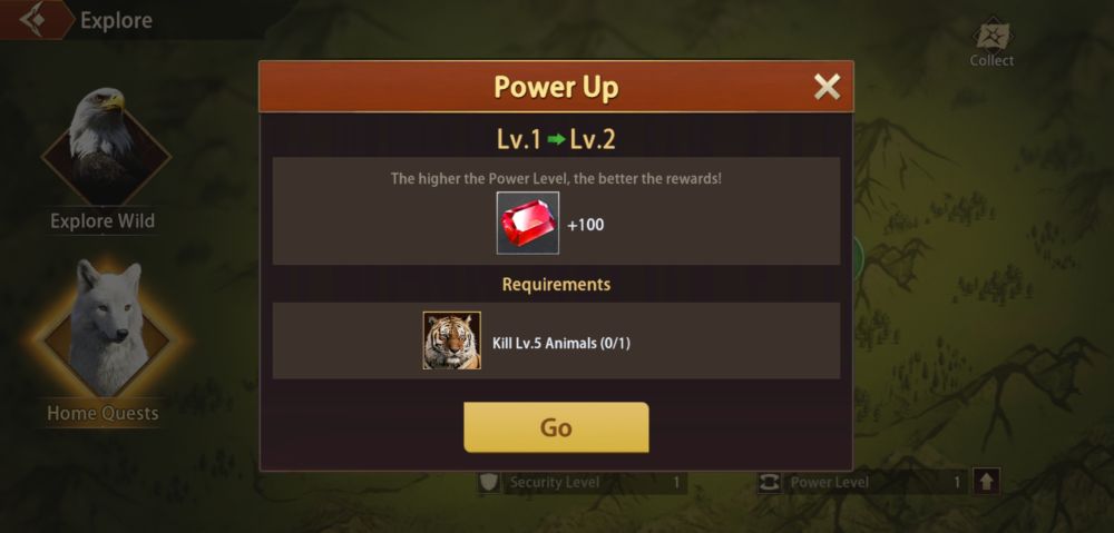 An increase in Power Level will allow you to gain better rewards when you explore and fight. Work your way up to defeating higher level animals by attacking creatures at the lowest levels first.