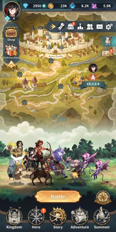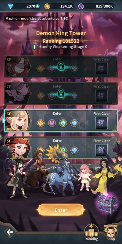 The Demon King Tower resembles tower dungeon game modes in conventional strategy RPGs where your heroes set out to challenge 1 floor at a time in the tower. You can continue to use the same team across different floors as your HP and status resets after each battle, in contrast with conventional tower mechanics. There are rewards for first time completions and you earn Demon King Tower Coins idly dependent on how far up you have climbed. These special coins can be traded at the shop for S grade heroes and other valuables.