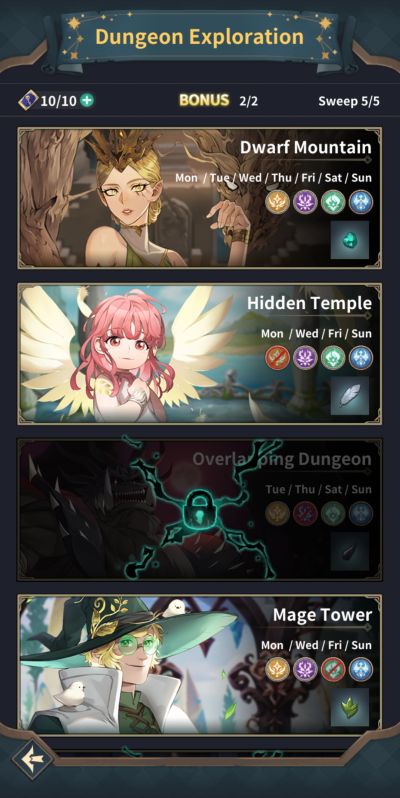 You have a maximum of 10 tickets to consume across any available dungeon for the day. Note that these tickets do not reset on a daily basis and instead replenish over time. Each dungeon is only available on specific days of the week as well so be sure to take note of available dungeons when you have specific material needs.