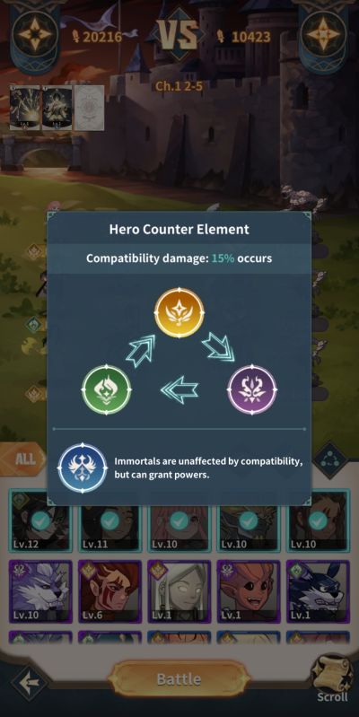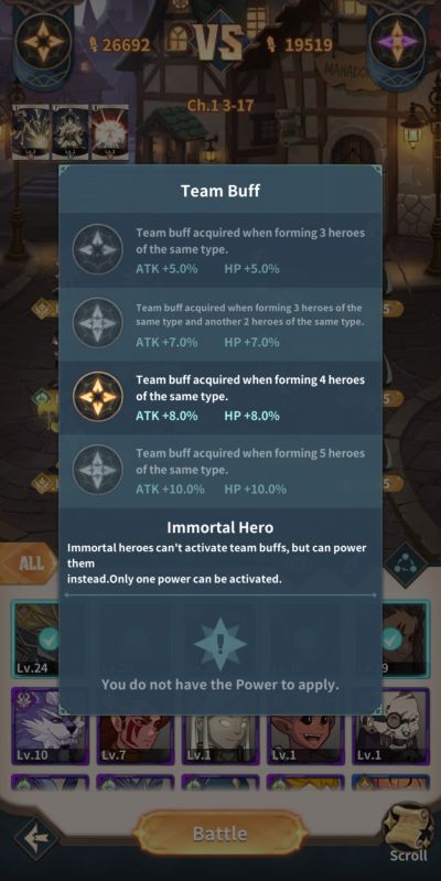 Another important consideration for building teams in addition to the above, are team buffs. Team buffs activate with 2 or more of the team members sharing the same race or elemental affinity, with the exception of Immortals. An HP and attack boost of 5%, 7%, 8%, and 10% activate in combat if you have 2,3,4, and 5 heroes sharing the same element respectively.