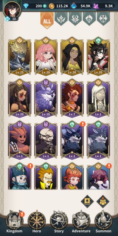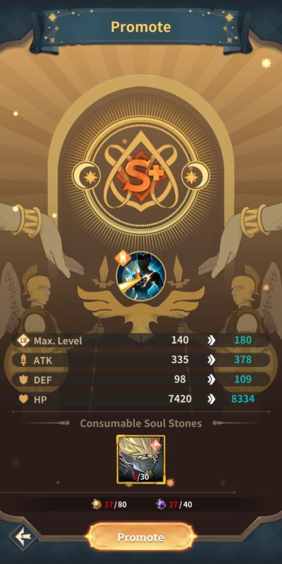 Heroes can also be promoted an improve their rarity grade as well as stats, among other things. Only soul essences are required up to rank S but hero shards add to the resources needed beyond that. Promotion also unlocks additional skills but not all heroes can be promoted to the top grade which is SS+. SS rank heroes can further be strengthened via reinforcement feature under the skills window and SS+ rank heroes have unique abilities that unlock as well.
