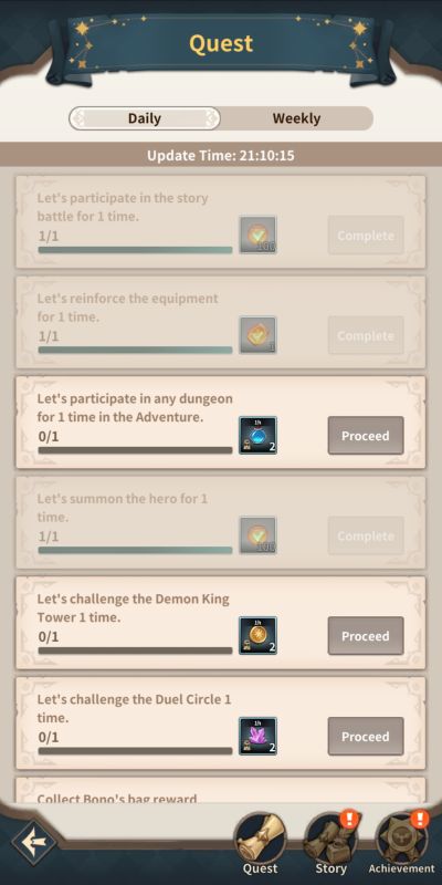 Story quests, on the other hand, all relate to progression within the game’s main campaign. Finally, achievements serve as a record of your milestones across different aspects of the game and can be a great source of diamonds early on.