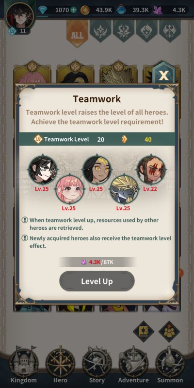 On the hero page, which can be accessed via its icon at the bottom of the screen, the lower right icon leads to the teamwork level. This feature increases the level of all heroes in your roster and costs magic crystals. In a way, this makes spending resources on heroes you would otherwise replace viable as resources will be returned once teamwork level is increased. There are simply circumstances when you need resources on hand to boost the combat power of units you use to push through a battle victoriously.